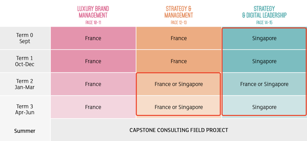 • 战略与管理 | 法国校区与亚太校区(新加坡)• 数码业务与创新 | 亚太校区(新加坡)• 金融 | 法国校区• 奢侈品品牌管理 | 法国校区• 酒店管理 | 法国校区
