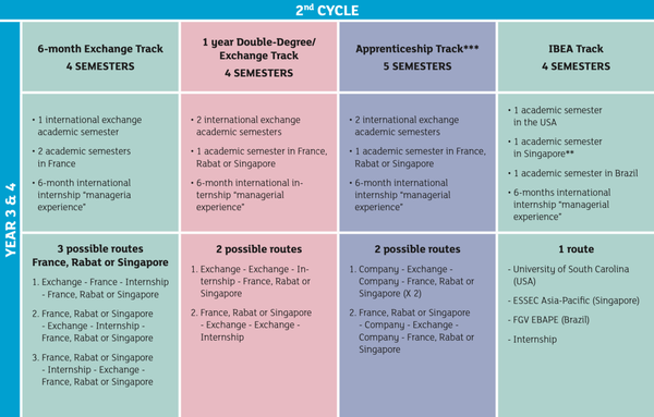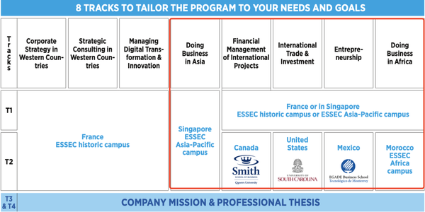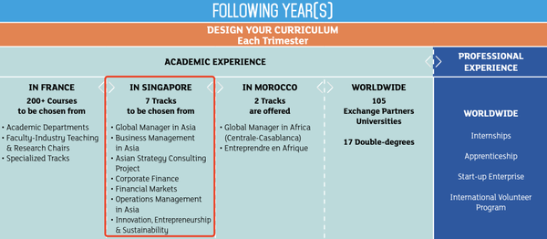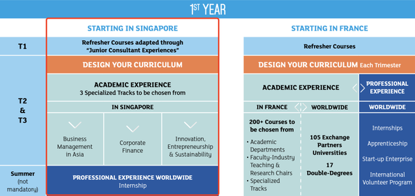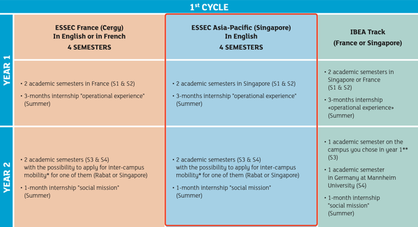 欧洲、亚洲、非洲、北美和拉丁美洲的多校区培养方案:根据所选择的专业方向,学生将在ESSEC的法国校区和新加坡校区完成一部分课程,另一部分则在交换的国际学校完成。