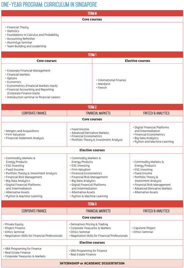 学生可以选择法国校区(Cergy、巴黎地区)或ESSEC亚太校区(新加坡)的课程。ESSEC金融学硕士的课程设置灵活。在15个月的学制期间,学生需修满90 学分的课程。除了上课以外,学生们还需要参与学习之旅,并且撰写学术论文或完成实习项目。