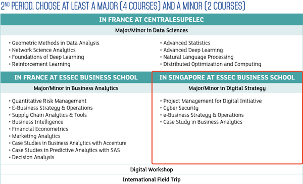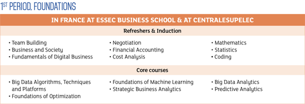 该项目学制为12-16个月,分为三个学习阶段。在第一阶段,学生将在ESSEC和巴黎中央理工-高等电力学院(CentraleSupélec)学习基础课程和核心课程;在第二阶段,学生根据个人兴趣和职业规划在三个专业方向(数据科学、商业分析学、数字策略)选择一项进行深入研究,还可以参加各种各样的国际游学项目;在第三阶段,学生需在企业实习,并撰写毕业论文。