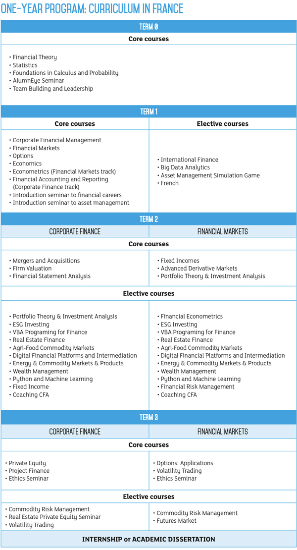 金融学硕士这一项目包括21门核心必修课程和29门选修课程。第一学期,学生将在法国或亚太校区学习一系列必修和选修课程,掌握金融学基础知识;第二学期,学生可以根据自己的爱好和职业规划从两个专业方向(公司金融或金融市场)中选择一项。