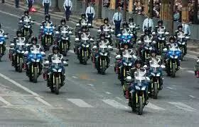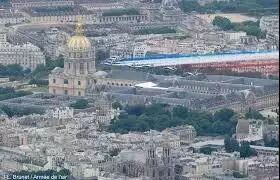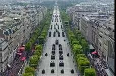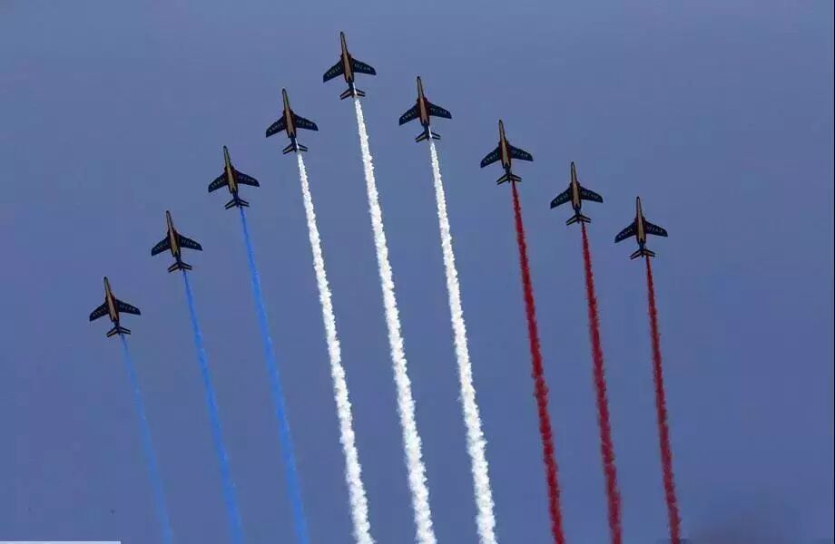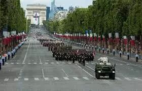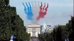 7月14日,香榭丽舍大街上的游行是每年法国国庆假期的亮点之一。首先由巡逻军编队从香街上空飞过,机尾喷出蓝白红三色烟幕,宛如巨大的法国国旗飘扬在香榭丽舍大街上空。仪仗队从凯旋门出发,走过香街,抵达协和广场。紧接着,直升机部队,摩托部队和骑兵部队依次接受法国总统的检阅。