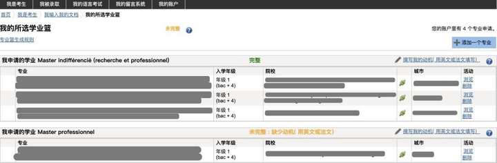 2. 选择您的专业:点击按钮 « 填写我的专业 » 。在 « 选择专业 » 的页面上最多做7个选择。这些选择可以是不同的院校和不同的专业。在 « 我查找我的课程 » 里,可填写关键词进行查找。找到课程后,请添加至专业篮。对于每个选择,动机信必须清晰填写。重复此操作以添加您所有的专业。