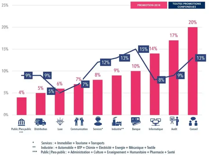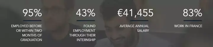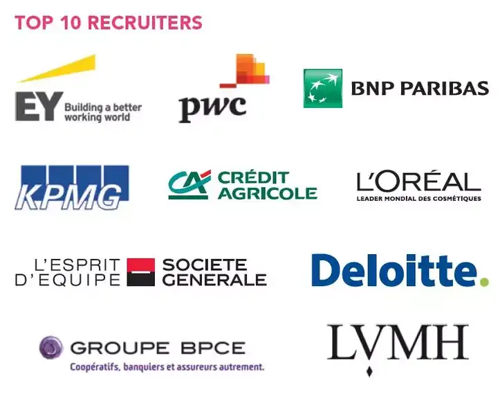 GE项目的前十雇主为安永、普华永道、法国巴黎银行、毕马威、法国农业信贷银行、欧莱雅、法国兴业银行、德勤、法国BPCE银行集团、LVMH集团