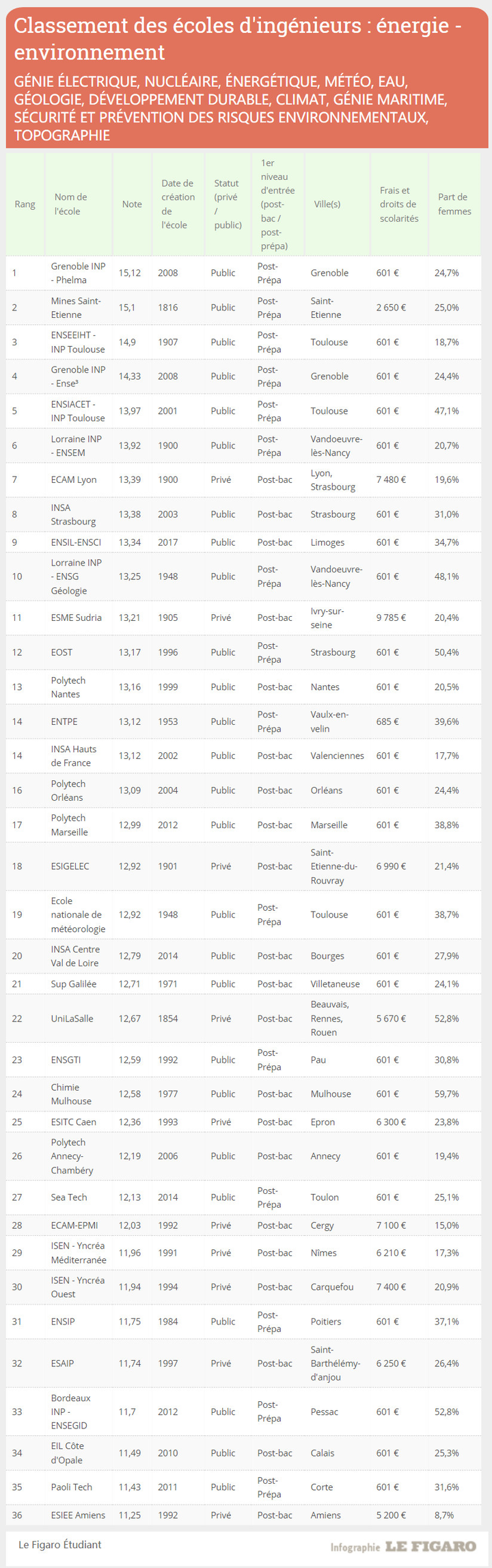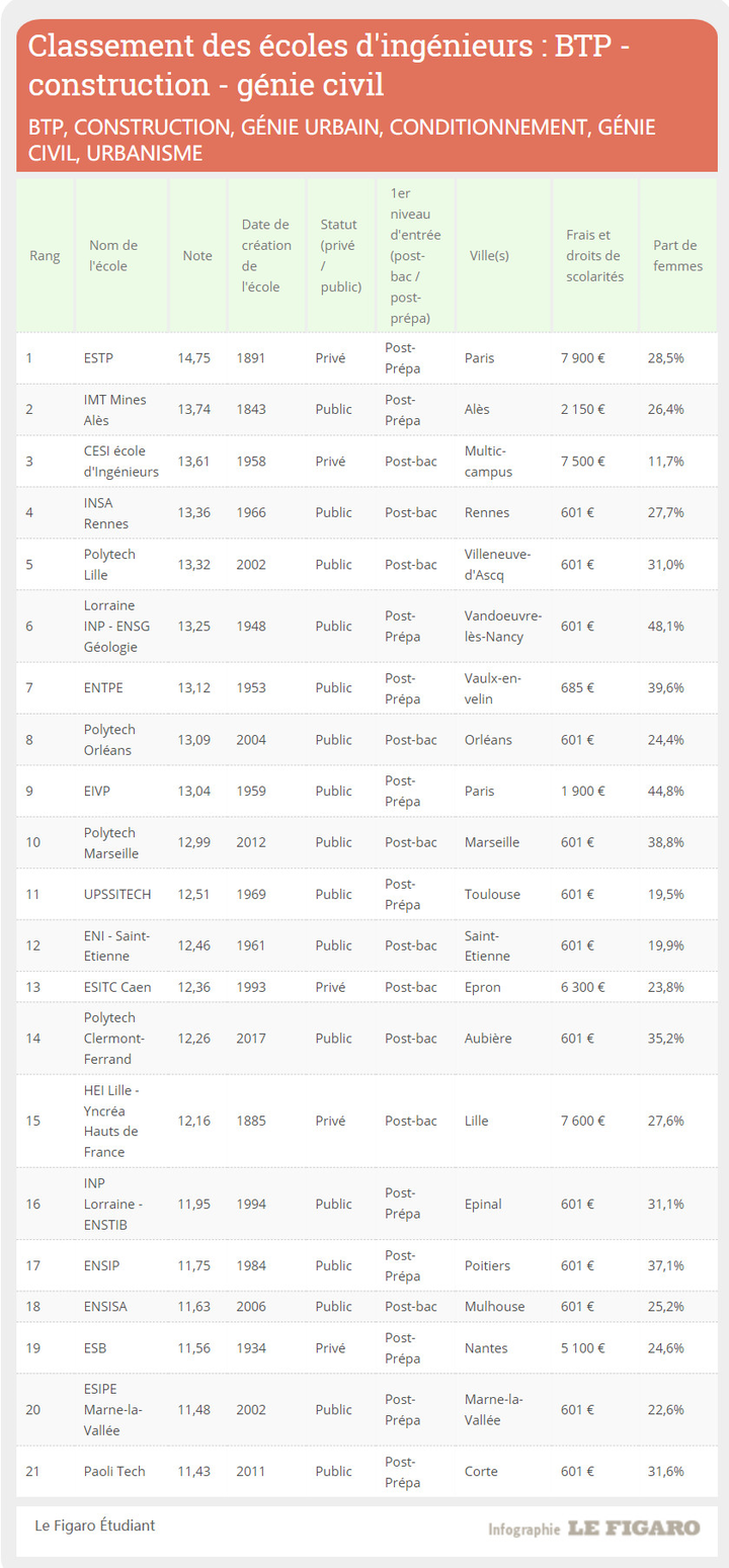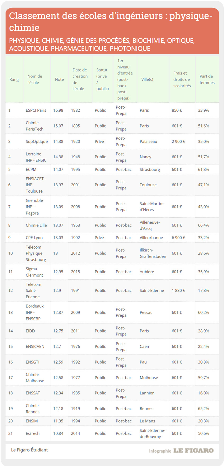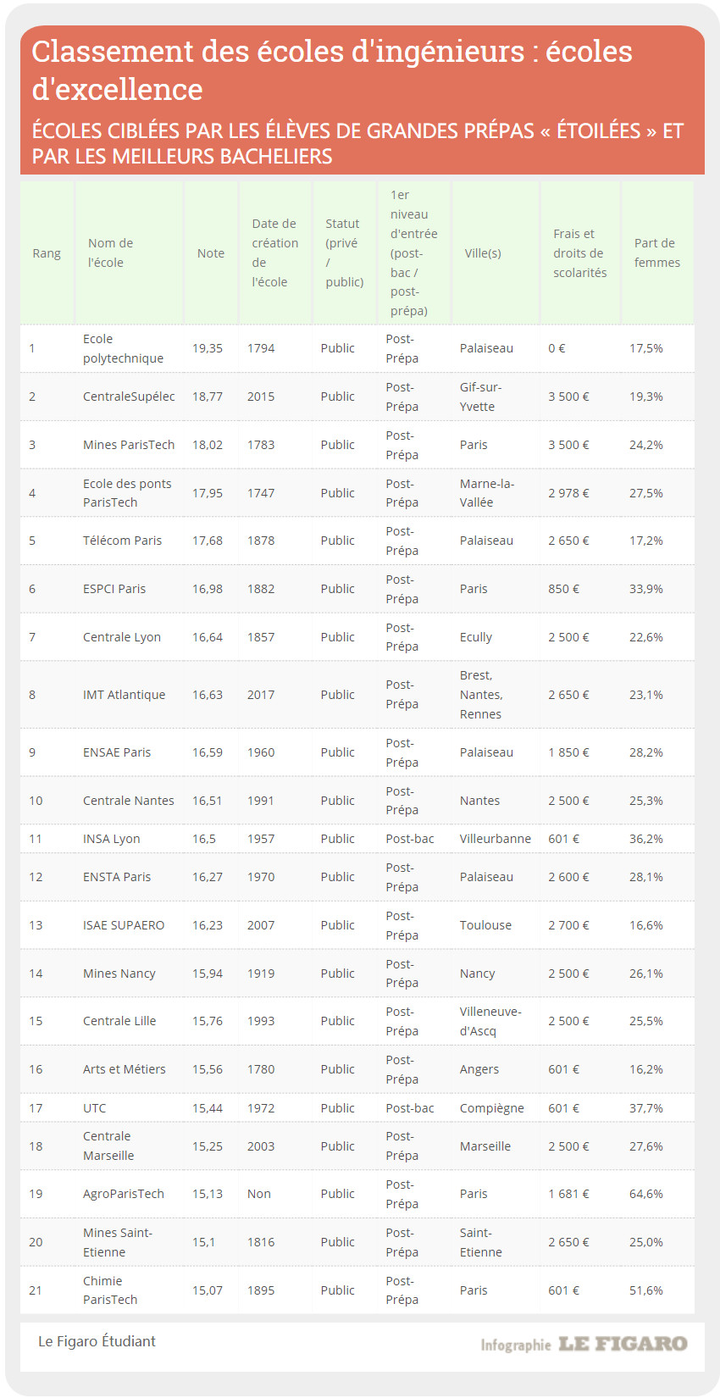 卓越学校排行榜共有21所院校上榜,由法国工程师院校中最有名望的几所学校和集团组成,分别为Polytechnique巴黎综合理工大学,Centrale中央理工集团的CentraleSupélec、Centrale Lyon、Centrale Nantes、Centrale Lille和Centrale Marseille,ParisTech巴黎高科集团的Mines ParisTech、Télécom ParisTech、Ecole des Ponts ParisTech、ESPCI Paris、ENSAE Paris、ENSTA Paris、Art et Métier、AgroParisTech和Chimie ParisTech,Institut Mines Télécom - IMT矿业电信联盟的IMT Atlantique、Mines Nancy、Mines Saint-Etienne (Mines ParisTech和Télécom ParisTech同时也属于IMT集团),INSA国立应用科学学院的INSA Lyon,ISAE SUPAERO,以及UT国立技术大学集团的UTC。