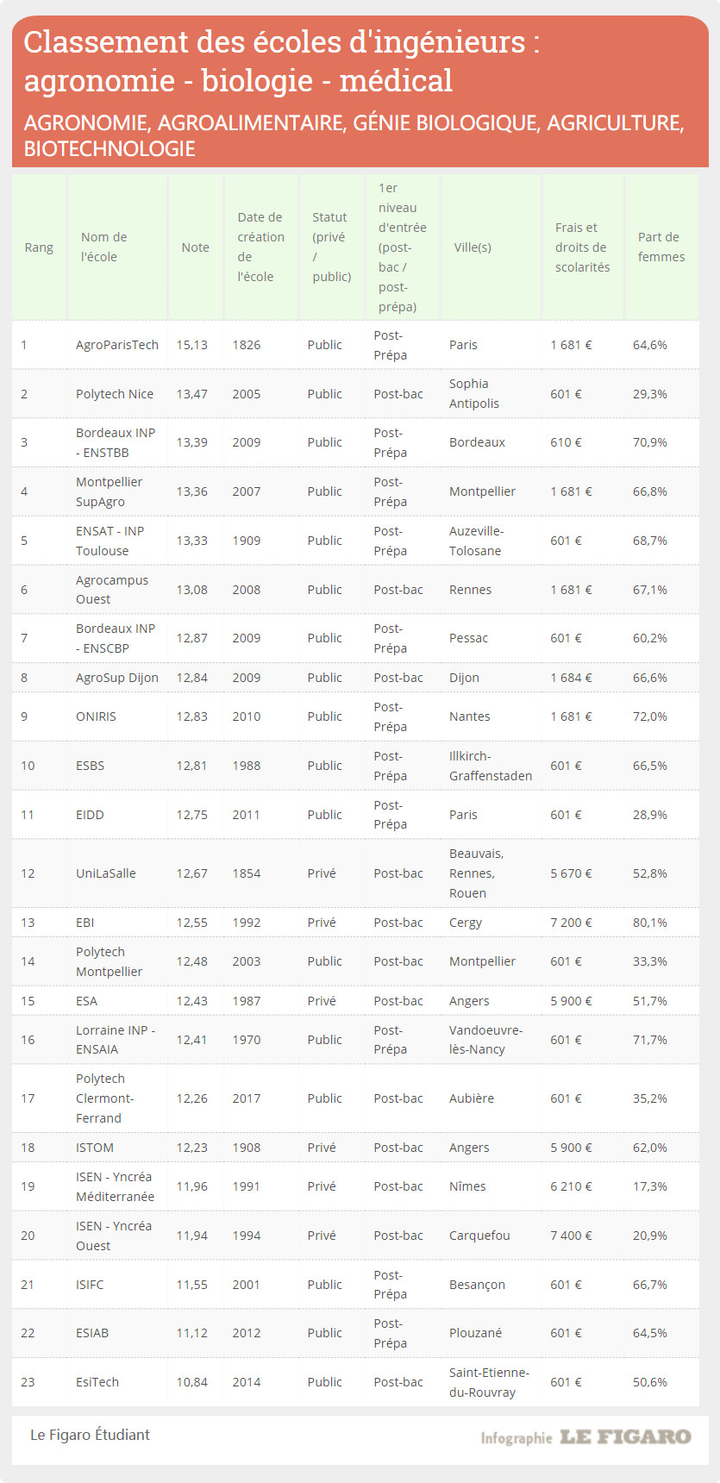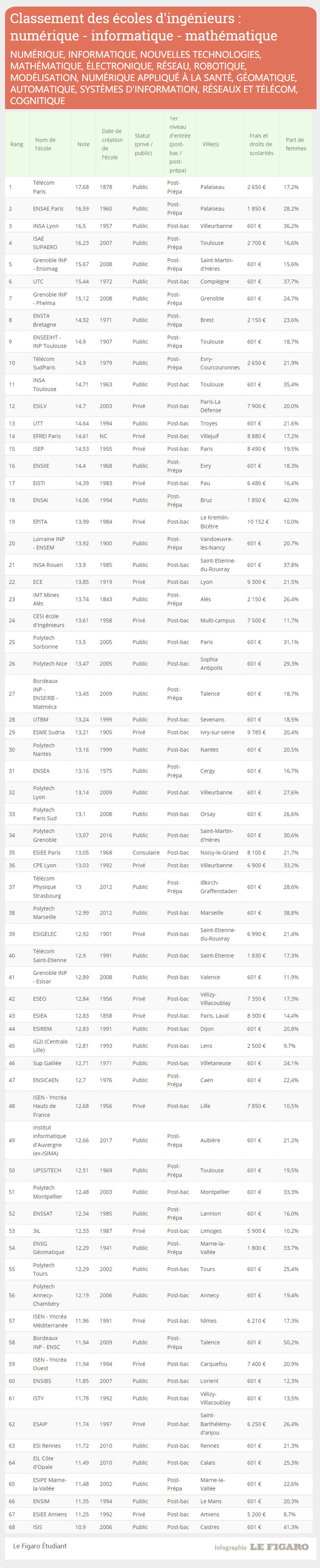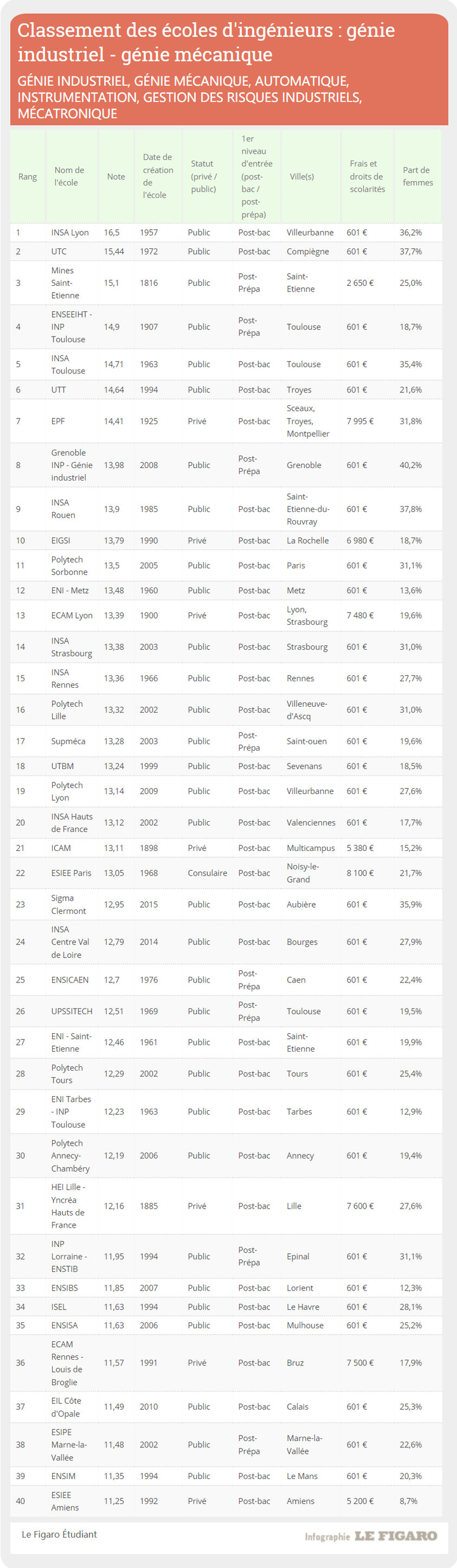 卓越学校排行榜共有21所院校上榜,由法国工程师院校中最有名望的几所学校和集团组成,分别为Polytechnique巴黎综合理工大学,Centrale中央理工集团的CentraleSupélec、Centrale Lyon、Centrale Nantes、Centrale Lille和Centrale Marseille,ParisTech巴黎高科集团的Mines ParisTech、Télécom ParisTech、Ecole des Ponts ParisTech、ESPCI Paris、ENSAE Paris、ENSTA Paris、Art et Métier、AgroParisTech和Chimie ParisTech,Institut Mines Télécom - IMT矿业电信联盟的IMT Atlantique、Mines Nancy、Mines Saint-Etienne (Mines ParisTech和Télécom ParisTech同时也属于IMT集团),INSA国立应用科学学院的INSA Lyon,ISAE SUPAERO,以及UT国立技术大学集团的UTC。