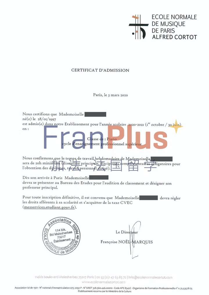巴黎高等音乐师范学院(École Normale de Musique de Paris Alfred Cortot):法国知名的私立音乐学院,多次获得法国文化部的高度评价,在国际上享有良好的声誉。