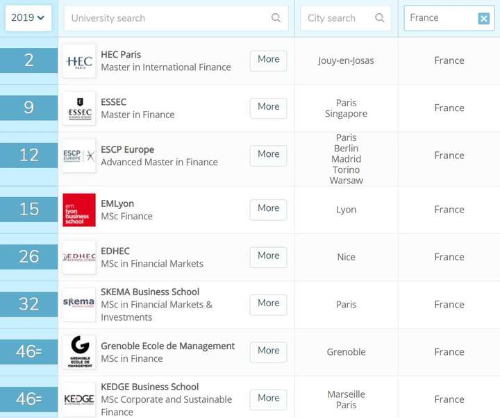 金融时报2019年给出的全球最新商学院排名中,top10中法国占了三个,分别为HEC, INSEAD, ESSEC,前二十中法国占了六个,依次增加了ESCP, EDHEC, EMLyon。在全球金融专业排名top10中,法国占了一半,分别为HEC,ESCP,EDHEC,SKEMA和ESSEC。