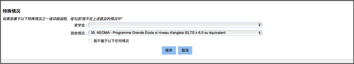 3. 在《我目前的个人情况》内的《特殊情况》栏目中,选择自己的免面签项目编号(诺欧商学院的编号为“35”),并上传您的录取证明或奖学金证明。