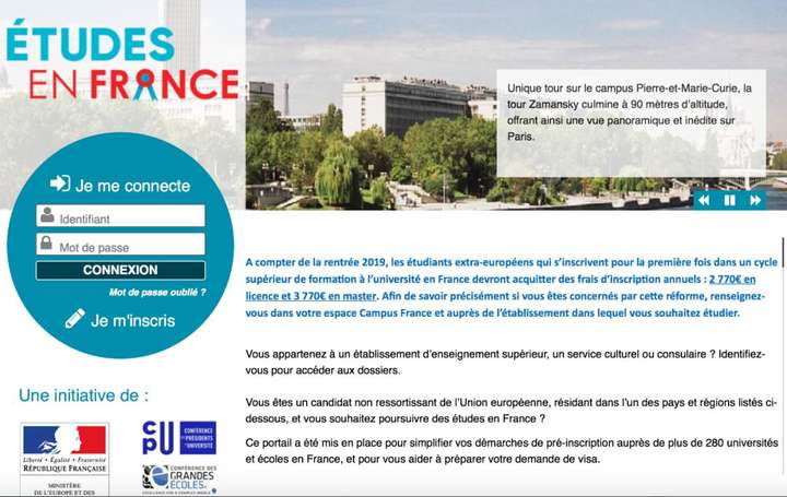 1. 在Etudes en France (https://pastel.diplomatie.gouv.fr/etudesenfrance)系统中注册并填写个人账户。如果您是交换生,请务必填写院校地址。您的材料将由院校所在地所属的法国高等教育署中心处理。