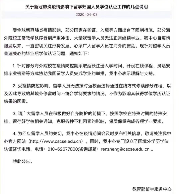 官方最细消息,教育部留学服务中心确认表示,网络授课不影响学位学历认证!