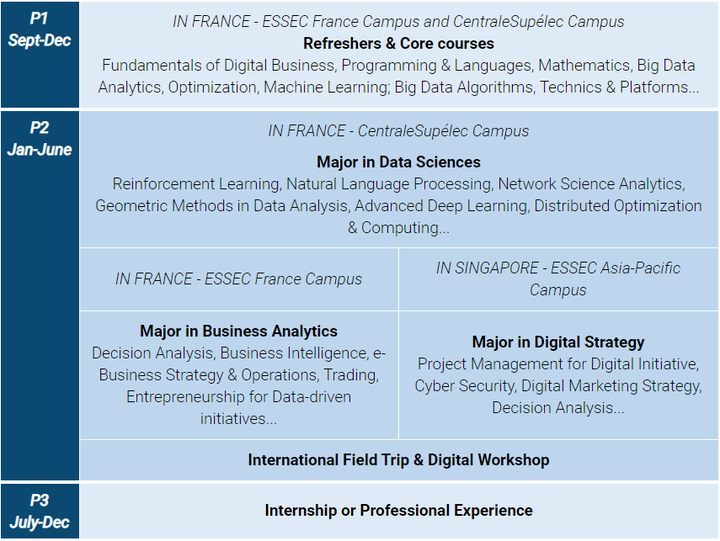 课程设置:该项目分为三个学习阶段。在第一阶段,学生将在ESSEC和巴黎中央理工-高等电力学院(CentraleSupélec)学习基础课程和核心课程;在第二阶段,学生根据个人兴趣和职业规划在三个专业方向(数据科学、商业分析学、数字策略)选择一项进行深入研究,还可以参加各种各样的国际游学项目;在第三阶段,学生需在企业实习,并撰写毕业论文。