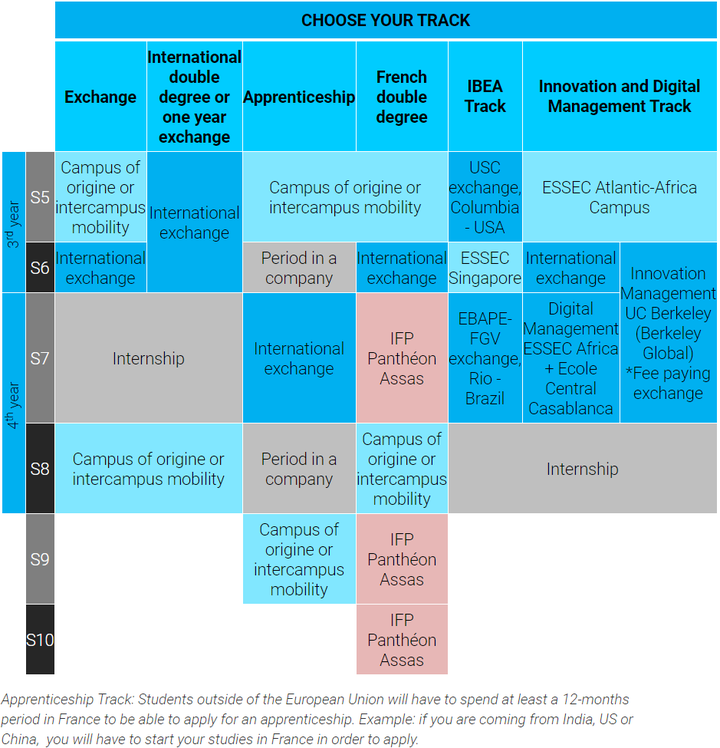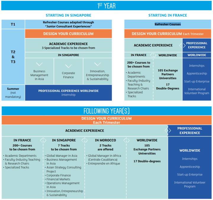 欧洲、亚洲、非洲、北美和拉丁美洲的多校区培养方案:根据所选择的专业方向,学生将在ESSEC的法国校区和新加坡校区完成一部分课程,另一部分则在交换的国际学校完成。