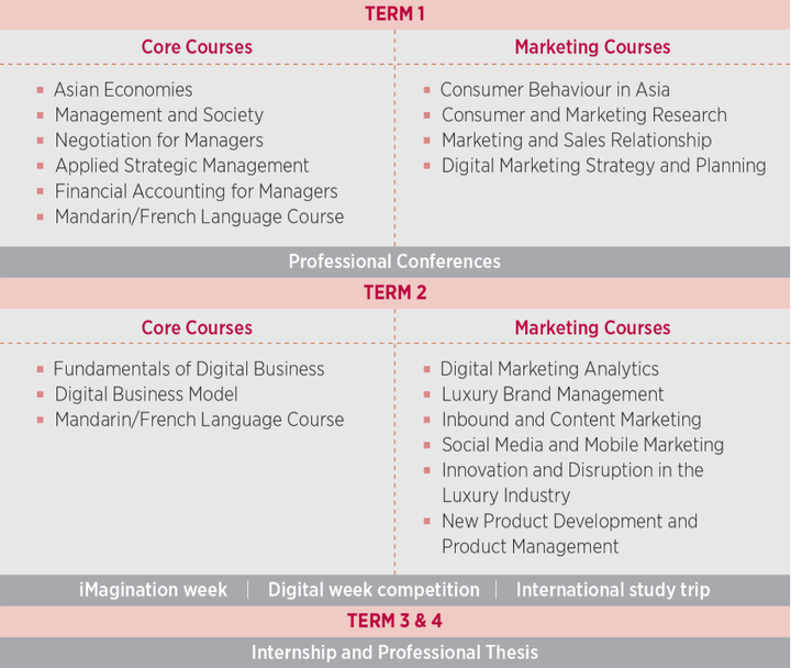 ESSEC市场营销管理与数字营销硕士为学生们提供亚洲市场营销的专业培训,让学生通过使用营销调查和战略分析工具,掌握营销各方面知识,培养实际应用能力。除了必要的营销基础知识(分析工具、数据处理)外,该课程重点强调数字与管理。它将引导学生们了解和掌握营销以及掀起销售和沟通等方面的数字革命。