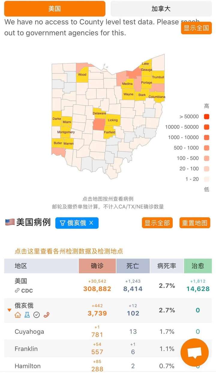 我所在的俄亥俄州确诊人数在美国前20位,但细看它的分布,最主要的大头在两个郡,其它的郡都只有两位数。有的郡一个确诊的都没有。
