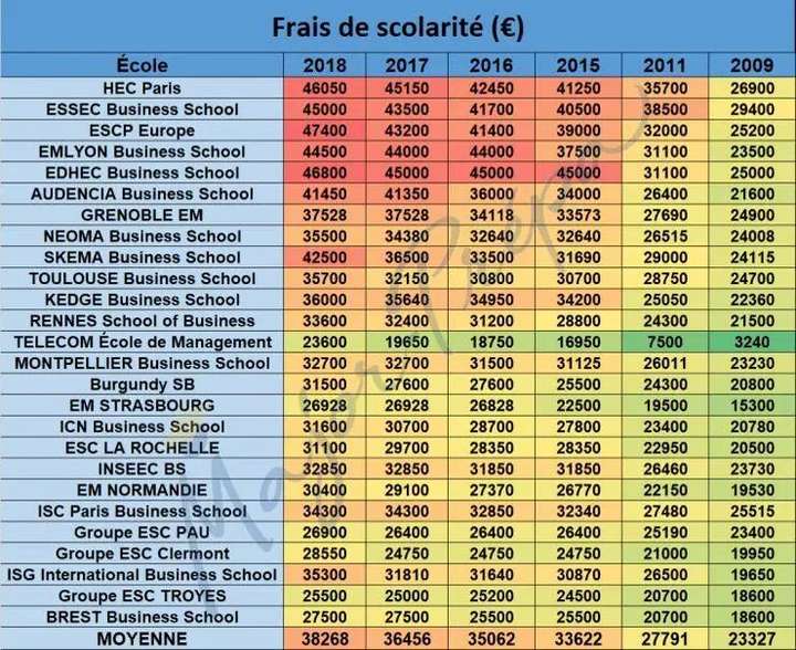 平均而言,近十年的学费上涨了73.4%,三年学费平均达到了约40,000欧元。最昂贵的学费一如既往的是HEC巴黎高等商学院收取的,现在要求49,950欧元(以法国学生收费为例),紧随其后的是ESCP欧洲高等商学院49,150欧元(以法国学生收费为例)。