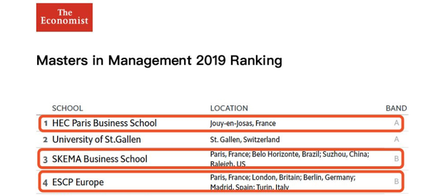 《经济学人》(The Economist)发布的2019全球管理学硕士排名中,全球最终共有40所院校进入排名。法国的商学院再次强势霸榜,共有10所入选,其中Top10里有4所法国商学院,Top5中有3所,分别是HEC、SKEMA和ESCP。