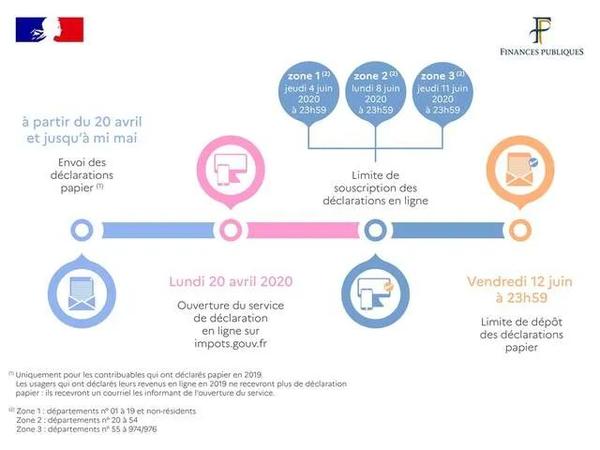 各个省份不同,截止日期也是不同的:1-19的截止日期为2020年6月4日晚24点。20-54的截止日期为2020年6月8日晚24点。55-974/976法国以及海外省的法籍纳税人截止日期为2020年6月11日晚24点。