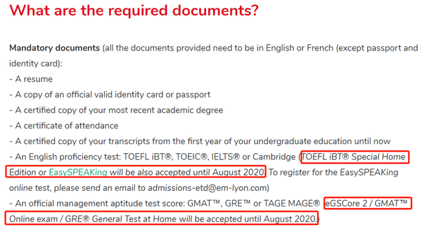 (EM Lyon表示2020年8月前接受线上测试成绩)
