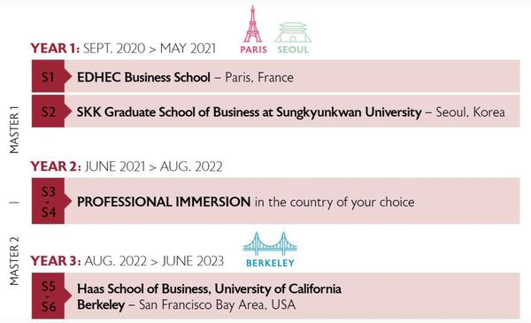 Ø 第一年:2020年9月将在EDHEC巴黎校区学习。从2021年1月到五月,将在韩国首尔成均馆大学SKK成均馆大学商学院学习。这期间经常会和MBA的学生一起关注与亚洲市场相关的商业主题。Ø 第二年:“间隔年”。工作经验是就业的关键:许多的学生都通过实习找到工作。同时可以丰富个人简历和探索感兴趣的行业。这一年可以在世界的任何地方完成实习。Ø 第三年:将在加州大学伯克利分校的哈斯商学院完成一年的学习。