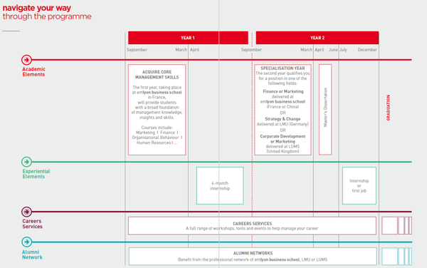 主要课程有高级企业金融,财务会计,管理和成本会计,金融经济学,财务诊断,金融宏观经济学,投资组合管理,保险市场等。——市场营销(Marketing)里昂商学院(里昂校区或上海校区)上课。主要课程有营销战略与实施,消费者行为、广告与传播,电子商务和电子零售,ECR和类别管理,品牌推广和网络营销,服务营销,量化营销,消费者洞察进展等。——策略和变革(Strategy & Change)德国慕尼黑商学院(Ludwig Maximilian Universität)授课。该专业课程涉及管理的多个方面,这些方面与高级管理人员在多变的商业环境中面临的挑战息息相关。通过案例分析、创新与战略、创业和成长管理等课程,学生能够学会如何在企业中创造价值;电子商务、营销资产管理、战略转变等课程能够教会学生如何管理和创造可持续的利润;学生在完成管理、通讯、战略思维等课程后能够战胜领导阶层所面临的挑战。——企业发展(Corporate Development)英国兰卡斯特大学管理学院(Lancaster UniversityManagement School)创业,战略和创新部门提供。课程涉及多方面的培养,如公司战略、兼并和收购、国际化和创新等。主要课程有:跨国并购,战略实施和流程,实践创新,家族企业管理,全球公司战略,企业创业,国际化和新科技等。