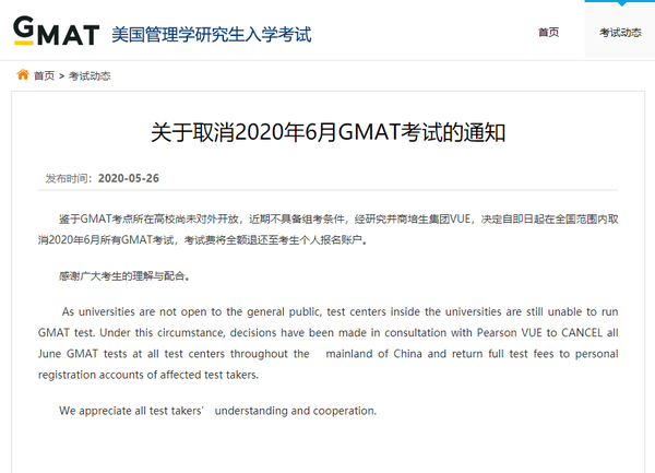 鉴于GMAT考点所在高校尚未对外开放,近期不具备组考条件,经研究并商培生集团VUE,决定自即日起在全国范围内取消2020年6月所有GMAT考试,考试费将全额退还至考生个人报名账户。