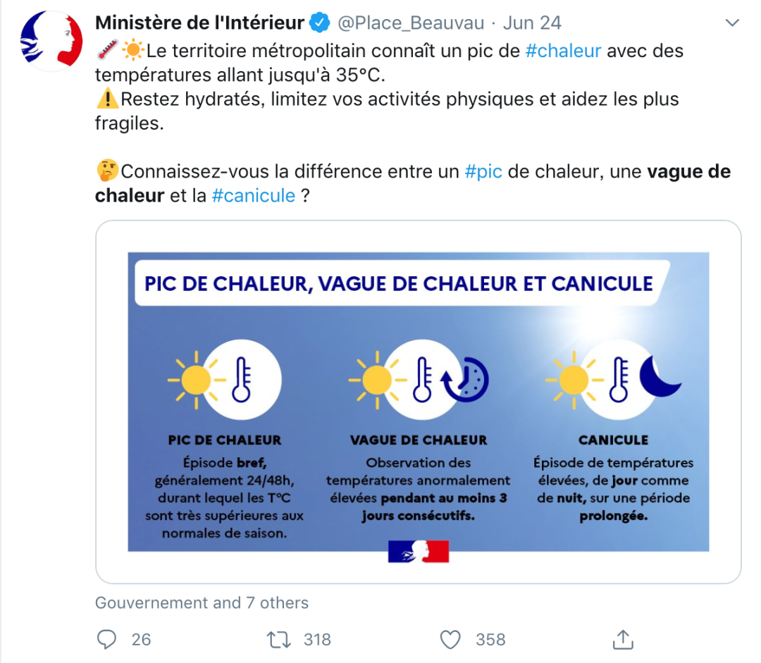 法国气象局报道:“从周四开始,全国的气温将上升一个档次。” 预计周五将出现一个新的热峰,比本周初的波及范围更大,甚至更加强烈。