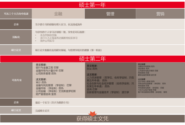 在硕士阶段,第一年分了金融、管理、营销三大方向,在第二年进行细分。2020学年ESSCA的专业将多达27个可选,其中包含9个学徒制项目,有些是英文授课,有些是法文授课,同时授课地点可能在不同校区。
