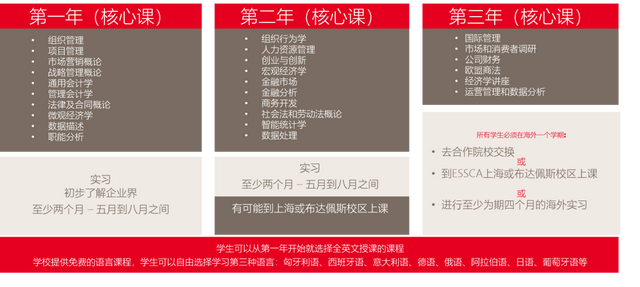 授课语言:第1-3年本科阶段法语授课,第4-5年硕士阶段英语授课