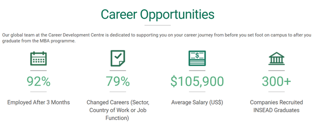 根据最新发布的数据,INSEAD MBA毕业生毕业时的年薪中位数为104,500美元,奖金中位数为25,000美元,这样年收入的中位数为129,500美元,合计人民币约104万元。以这样的速度,不需要花几年的时间就能够支付在欧洲最顶尖的商学院10个月课程的费用。