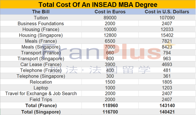 综上,在INSEAD法国校区读完10个月的MBA项目总计花费118960欧元,折合143140美元,人民币约95.4万元。新加披校区攻读总计花费116700欧元,折合140421美元,人民币约93.6万元。