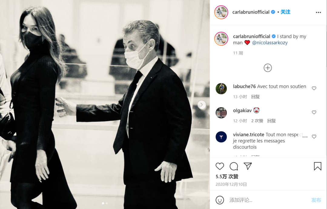 从2018年起,萨科齐便因“腐败”和“以权谋私”等多项罪名被起诉,布鲁尼始终站在了他的身旁。去年12月,布鲁尼曾发帖称“我会站在我男人身边”,以示对萨科齐的支持。