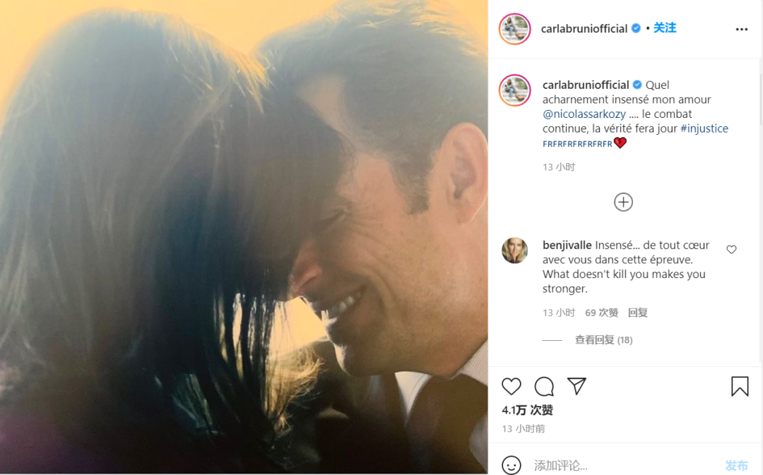 在萨科齐因贪污腐败和滥用职权被判有罪的同时,萨科齐妻子卡拉·布鲁尼(Carla Bruni)很快表态支持萨科齐。在其Instagram发表了动态写道:“我的爱多么疯狂,我的爱人 ....战斗仍在继续,真相将出现。”并且tag了#injustice的标签,配上了她和萨科齐头对头的照片。