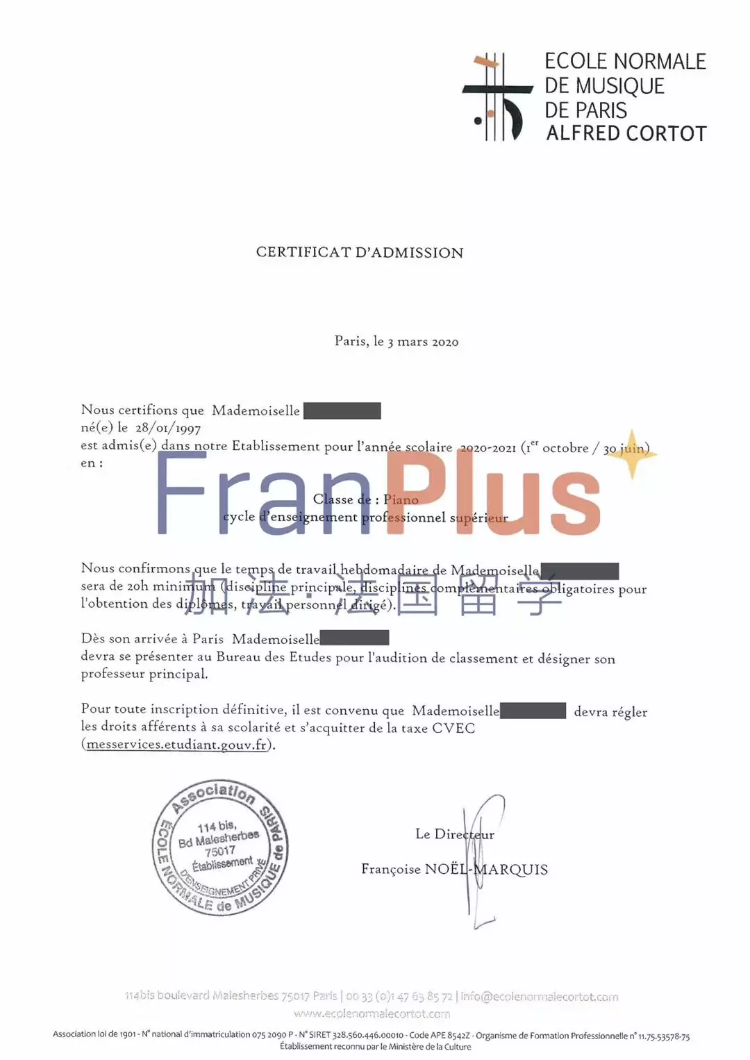 Dossier à envoyer à l’adresse :École Normale de Musique de Paris