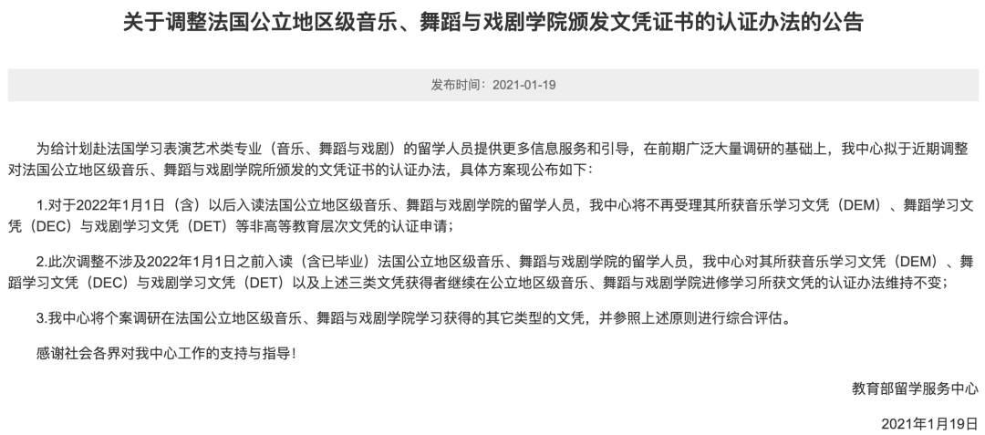 今年1月,教育部留学服务中心发布重要通知,将不再受理2022年1月1日(含)以后入读法国公立地区级音乐、舞蹈与戏剧学院的留学人员所获音乐学习文凭(DEM)等非高等教育层次文凭的认证申请。