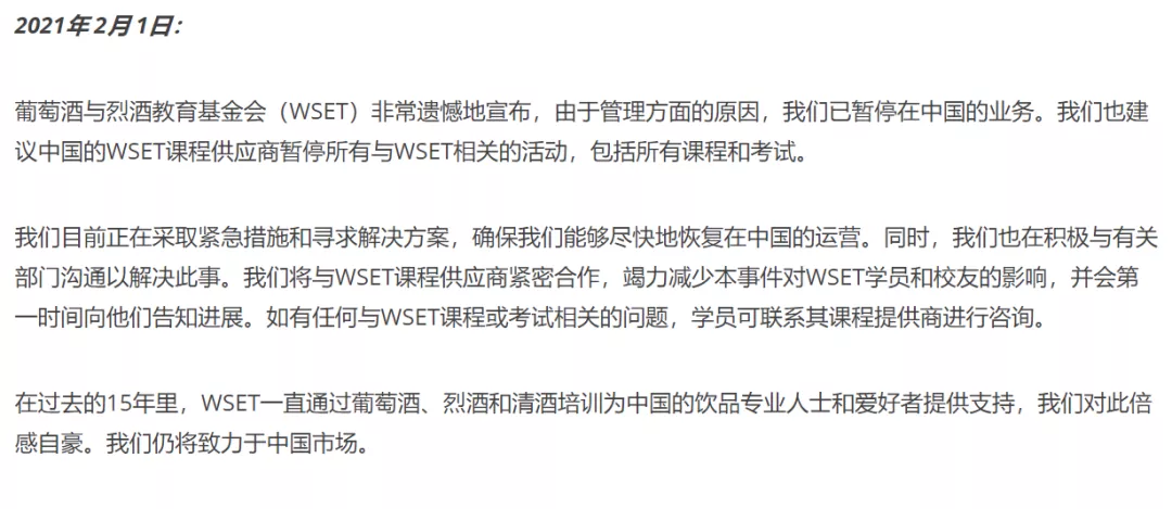 声明中称:葡萄酒与烈酒教育基金会(WSET)非常遗憾地宣布,由于管理方面的原因,已暂停在中国的业务。他们也建议中国的WSET课程供应商暂停所有与WSET相关的活动,包括所有课程和考试。