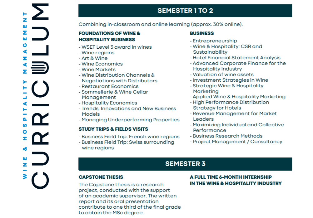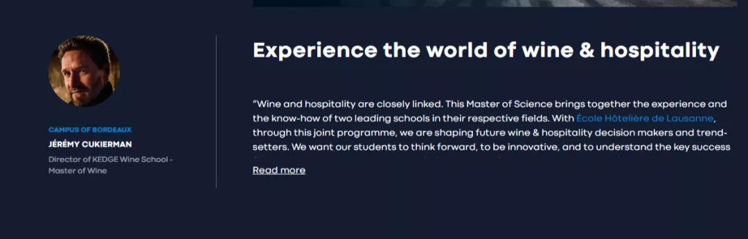 该项目由地处全球葡萄酒之都波尔多拥有自己的葡萄酒中心的法国KEDGE凯致商学院和酒店和休闲管理专业全球第一的瑞士洛桑酒店管理学院合作开设。通过该课程,年轻的毕业生和专业人士将能够在葡萄酒和酒店业务中获得独特的战略优势,并从最好的酒店管理学校和领先的葡萄酒管理机构那里获得知识。