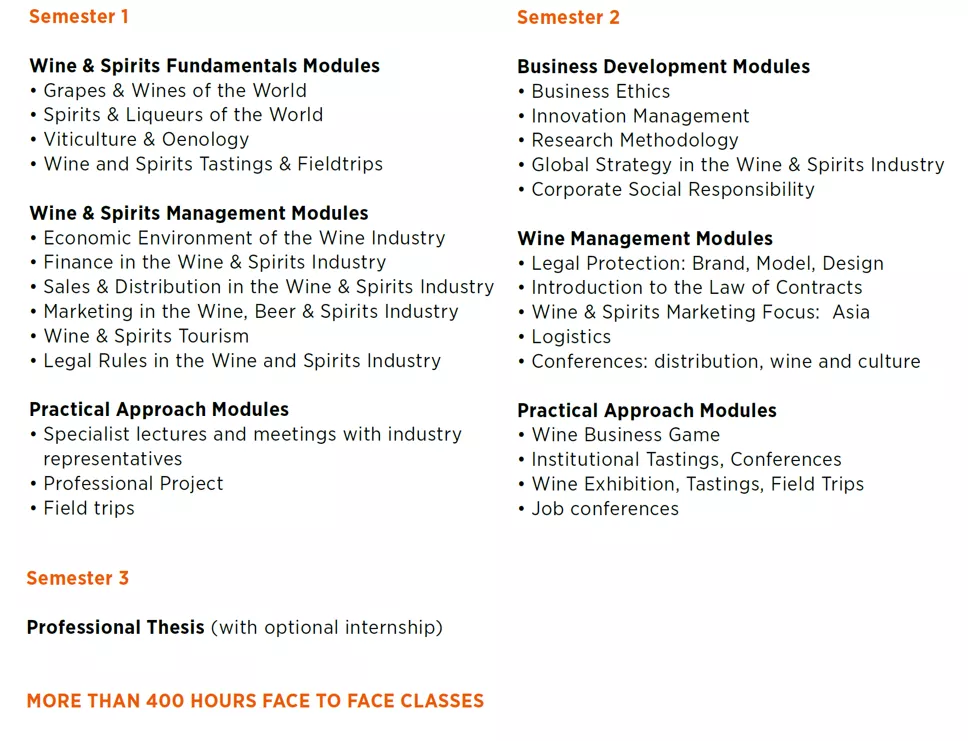 课程中包括葡萄酒出口以及葡萄酒与烈酒法律相关的特色课程,帮助学生加深对于葡萄酒管理市场的了解。项目包括在欧洲主流的葡萄酒或烈酒产区开展实地考察,或参观葡萄酒和烈酒生产者和出口商企业的“学习之旅”进一步加深对葡萄酒产业的了解。