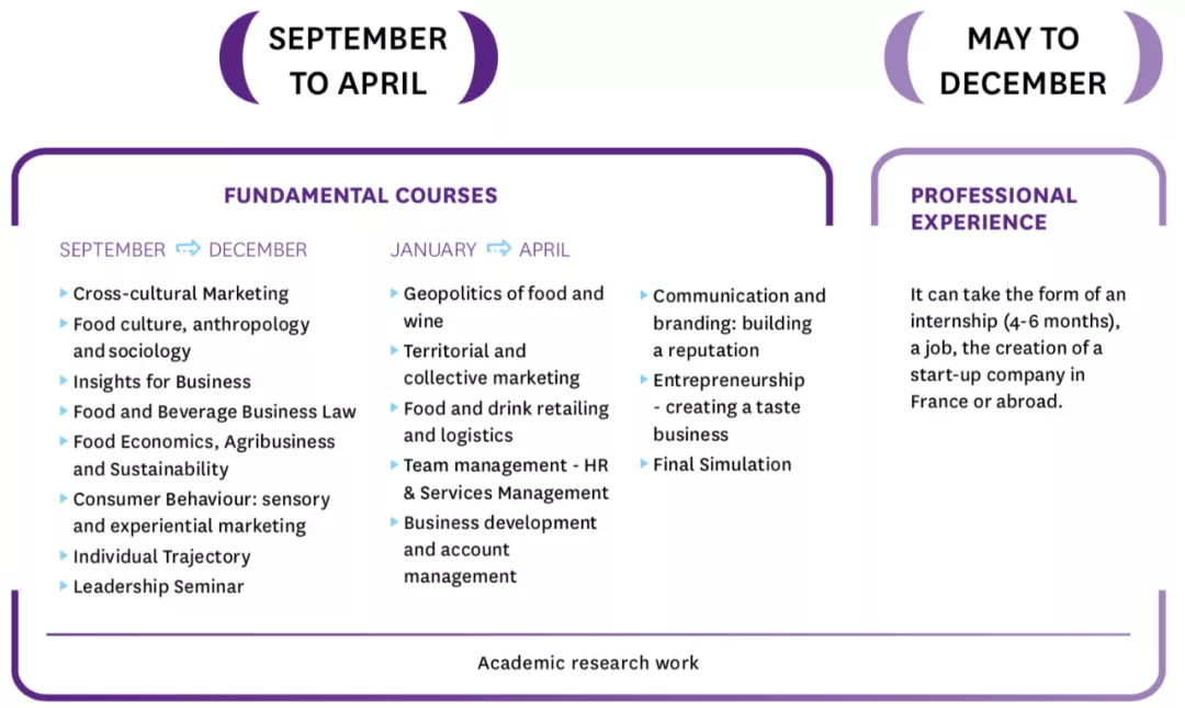 本专业位于香槟区,世界上最具美食文化的国家之一的中心-无语伦比的学习生态系统,距离巴黎仅45分钟车程。旨在为学生提供深厚的饮食文化背景和扎实的理论基础,使他们成为各类食品、葡萄酒和饮料相关行业的高效管理者。侧重于有关食品、香料、葡萄酒、烈酒和其它饮料的消费者与公司决策。