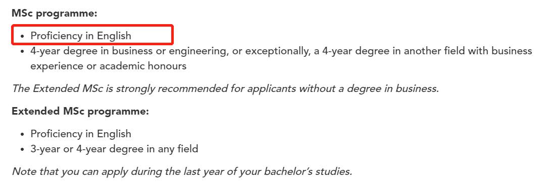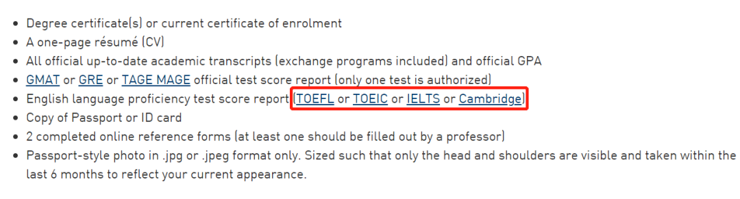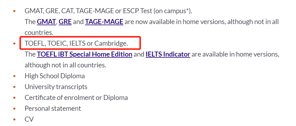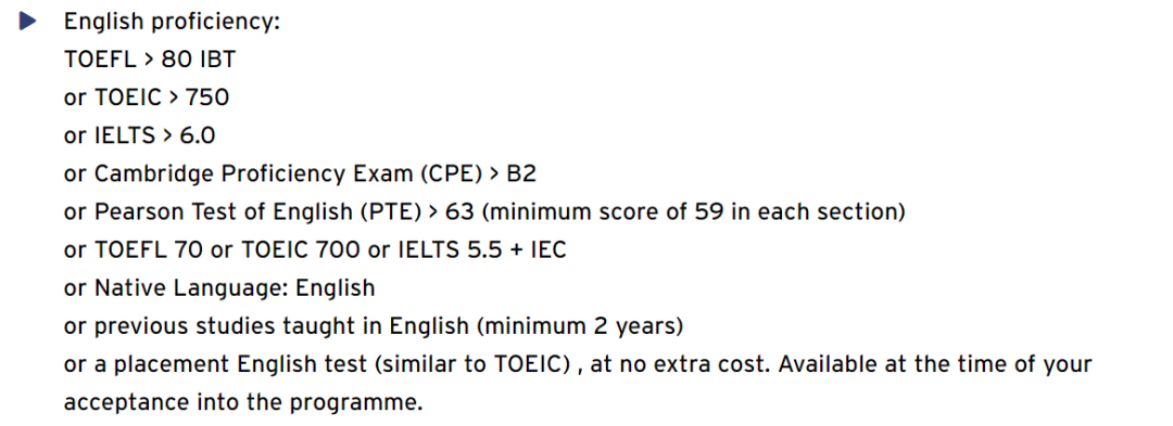 如EDHEC和ESSEC公布的英语要求,雅思、托业、剑桥的分数均一致,不过前者的托福要求是92分,后者则是95分。因此,如果你选择了雅思以外的英语考试一定记得确认一下学校对该项考试具体要求。