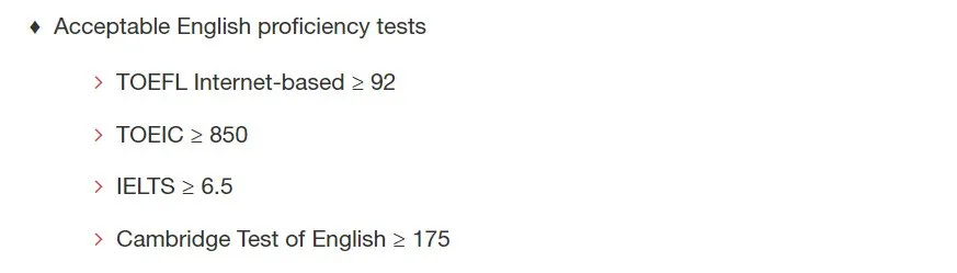 托业最低要求850,雅思最低要求6.5,托福最低要求92,剑桥英语最低要求175分。如果你是英语母语者,或者接受了至少3年的全英授课高等教育,则免于提交英语成绩。