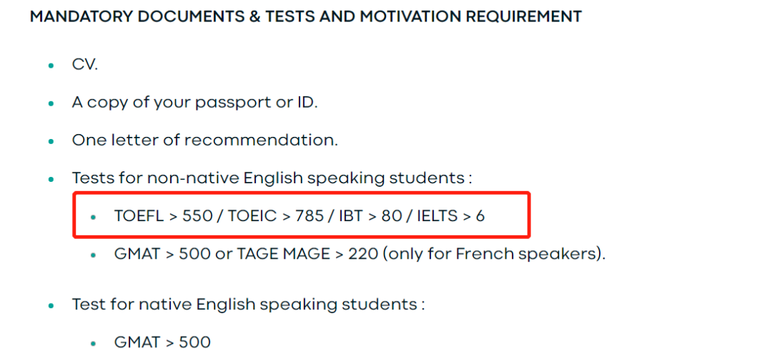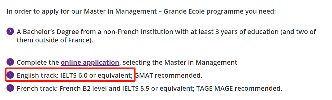 这四项成绩在官网里面明确写着被接纳,不过没有注明具体的要求。作为法国最顶尖的商学院,我们一般建议学生英语成绩在雅思7.0以上。