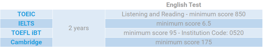 托业L&R最低要求850,雅思最低要求6.5,托福最低要求95,剑桥英语最低要求175分。如果你是英语母语者,或者接受了至少3年的全英授课高等教育,则免于提交英语成绩。