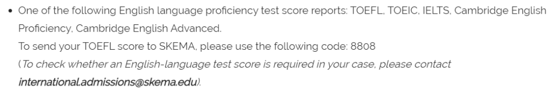 SKEMA接纳的英语考试:TOEFL, TOEIC, IELTS, Cambridge English Proficiency, Cambridge English Advanced.