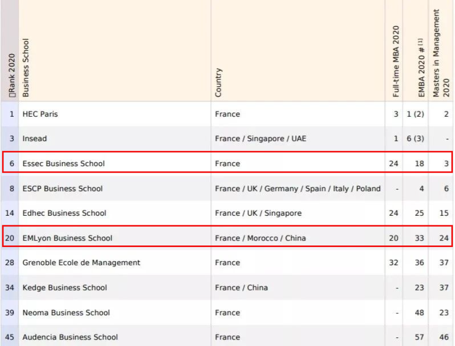 在英国《金融时报》Financial Times 2020年欧洲商学院排名中,法国商学院表现亮眼,共有22所法国高校上榜,是上榜最多的国家(英国19所上榜)。TOP10中法国占据其中四所。