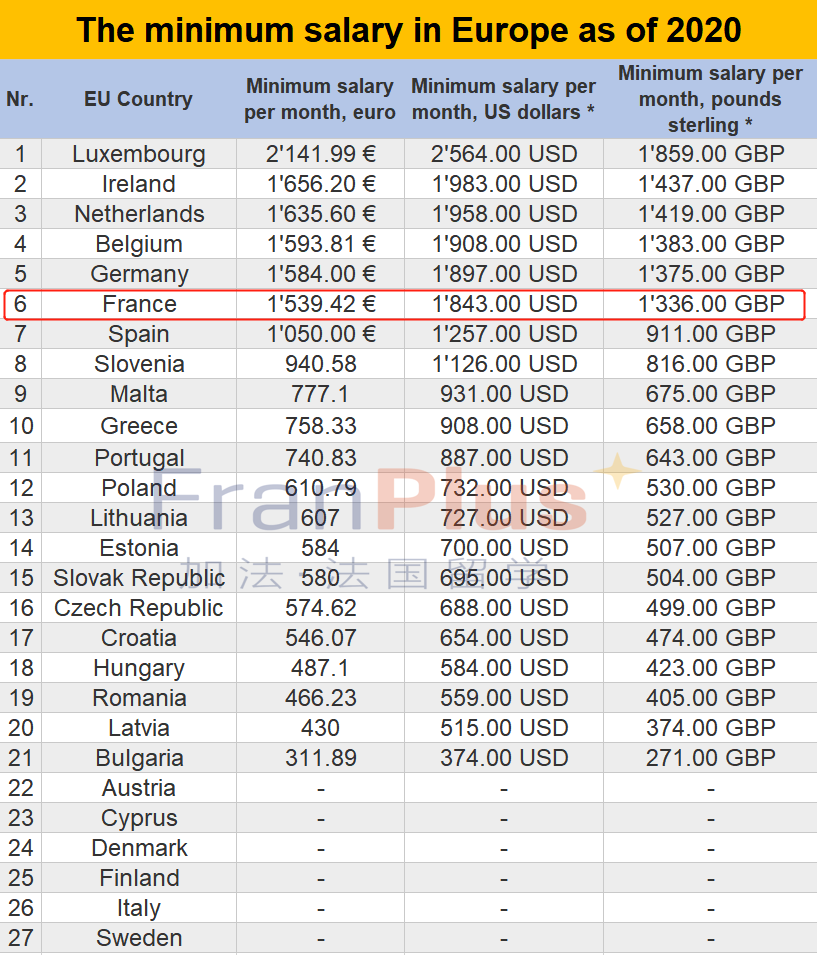 法国在欧盟的各国中最低工资水平排在第6位,每月最低工资1539.42欧元。