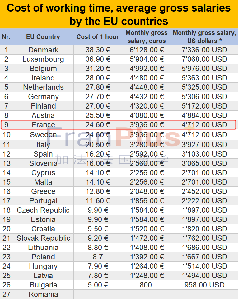 法国的平均工资水平在欧盟国家中排名第九,最低时薪是24.6欧元,平均税前工资为3936欧元。