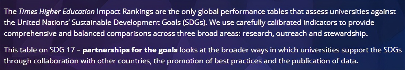 世界总排名是根据大学参加的所有的SDG单项排名中得分最高的前三名,以及SDG17(促进目标实现的伙伴关系)的得分合计产生的。