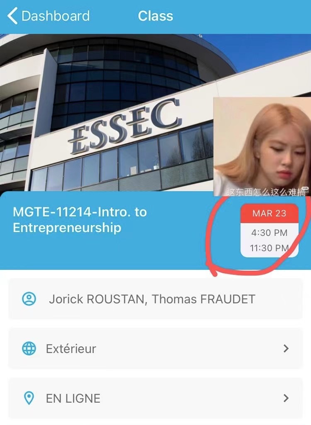 因为法国和中国的时差,国内的同学一般是下午开始上课,一直到晚上十一二点,最恐怖的是,上完课还不算完,很多科目都有小组合作,所以大家还会约着下课以后或者法国时间晚上开会讨论。