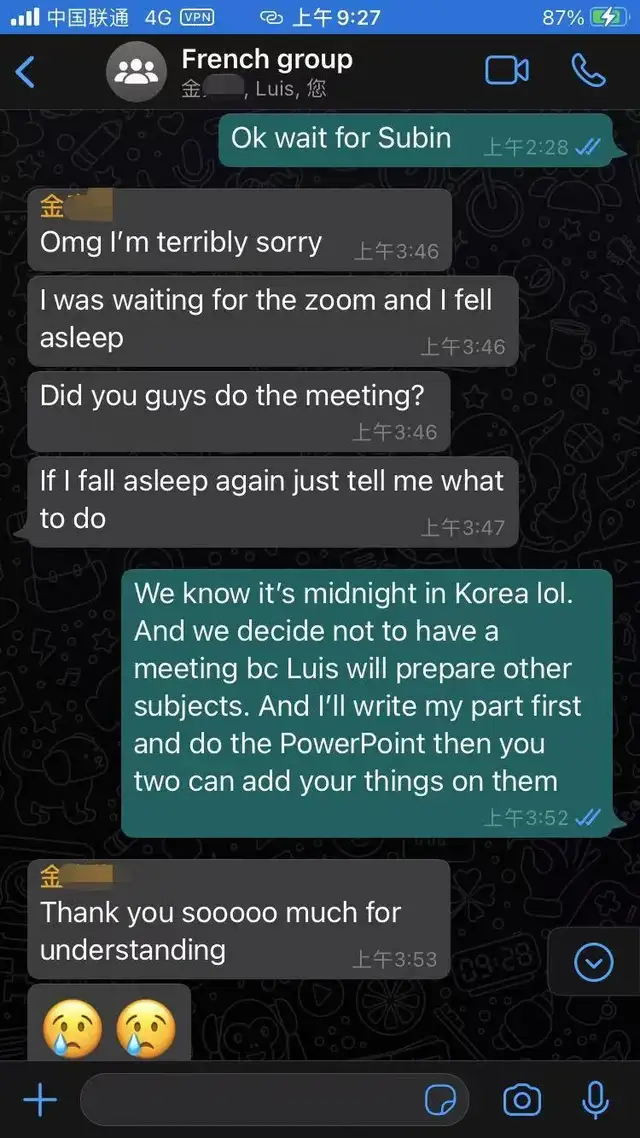 我的法语小组里面加上我只有三个人,大家都在不同的国家,有不可逾越的时差,好不容易约定好了一个时间讨论法语展示的内容,到了点却有一个韩国小姑娘睡过头了。